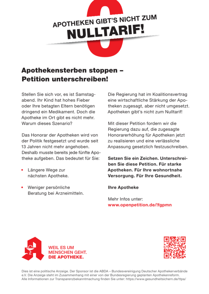 Wenn Sie Wert auf den Erhalt Ihrer Apotheke vor Ort legen, können Sie uns gerne unterstützen, indem Sie die an die Bundesregierung gerichtete Petition mitzeichen. -> https://www.openpetition.de/!fgpmn