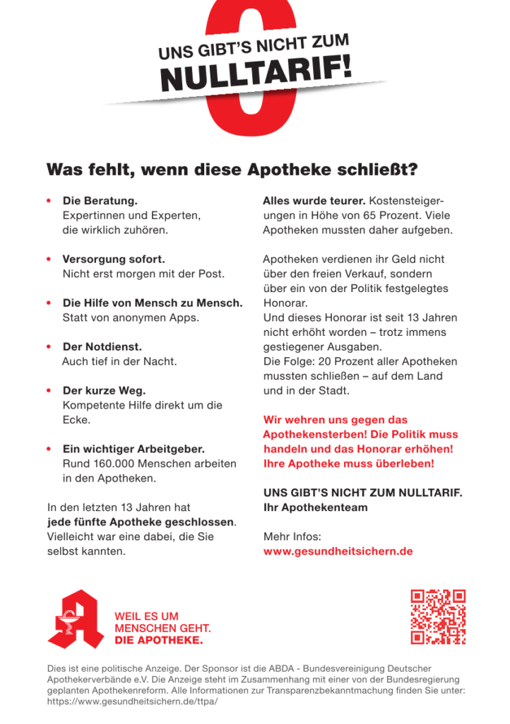 Pressemitteilung der ABDA zur Protestaktion: https://www.abda.de/aktuelles-und-presse/pressemitteilungen/detail/apotheken-beschliessen-bundesweite-proteste/